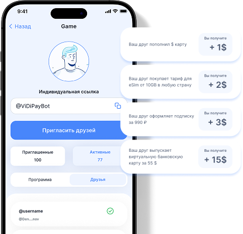 Приглашайте друзей в mini app Telegram, делитесь эмоциями от путешествий в соцсетях и получайте бонусы в USD за их активность.